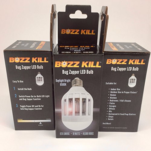 Two variations to choose from natural/day or warm/soft. Let's zap those dangerous mosquitoes and flying insects and reduce your energy costs at the same time how? By using the buzz kill bug zapper LED bulb. How does it work? Just screw in the bulb into any 110v fixture the soft blue UV light lures mosquitoes, flies, gnats and other insect pests to the grid where they will be zapped. The lower part of the bulb is an LED bulb used for general lighting. The LED and UV light can be turned on together or individually. What makes our bulb different? Saves money the LED bulb uses 9 watts of energy. The UV light uses 1 watt of energy. No buying costly pest control chemicals. The bulbs have a lumen (brightness) output of 920, which is slightly higher than a 60-watt incandescent bulb (800 lumens). Suitable for: Indoor and outdoor use kitchen, particularly for fruit gnats homes bedrooms/kid's rooms patios garages offices rv's restaurant and food prep stations shops hotels ... And more safe 100% safe for humans and pets. No chemicals, no fumes, no smell, no sprays, no mess you owe it to yourself and your family to have a bug free environment, click "add to cart" above now note: Cannot be used with a dimmer.Feature