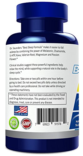 -. Binding : Health and Beauty -. Brand : Natural Sleep Aid 4U -. EAN : 0769923919782 -. Feature : START FALLING ASLEEP FASTER, sleep all night and wake up feeling fresh and energized with Dr. Saunders All natural sleep aid pills - a drug-free and potent formula - insomnia and sleep deprivation will soon be a thing of the past. / ALL NATURAL SLEEP AID PILLS with over 10,000 happy customers. Clinical studies sest these powerful ingredients help relax the mind and enhance sleep quality while supporting a natural role in the bodies sleep cycle* Try these natural sleep aid pills yourself 100% RISK-FREE! We have thousands of happy customers, worldwide! / CALMS and RELAXES YOU AT BEDTIME: Sometimes it's hard to unwind after a long day. That's when it's time for a boost of Melatonin and other proven ingredients that are closely involved in the bodies natural sleep cycle.* While other sleep products claim to help you fall asleep, ours Helps regulate your natural sleep cycle. / 100% SATISFACTION GUARANTEED: When you buy today you will receive a 100% MONEY-BACK GUARANTEE. If you're not satisfied for any reason, return your unused portion (OR EMPTY BOTTLE) for a full refund. No questions asked. / FAST ACTING & POTENT: These all natural sleep aid pills include strong, fast-acting natural sleep ingredients with zero side effects. Higher potency Melatonin formula plus Valerian, Passion Flower, Kava Kava Root, 5-HTP & more! 100% Drug-Free & Non-Habit Forming. Dr. Saunders Best Sleep Medication (all-natural formula) has you covered -. IsAdultProduct : 0 -. Label : Sleep Comfort Solutions, Inc. -. LegalDisclaimer : *This statement has not been evaluated by the Food and Drug Administration. This product is not intended to diagnose, treat, cure or prevent diseases. -. Manufacturer : Sleep Comfort Solutions, Inc. -. MPN : DeepSleep43 -. PackageQuantity : 1 -. PartNumber : DeepSleep43 -. ProductGroup : Health and Beauty -. ProductTypeName : HEALTH_PERSONAL_CARE -. Publisher : Sleep Comfort Solutions, Inc. -. Studio : Sleep Comfort Solutions, Inc. -. Title : #1 BEST All Natural Sleep Aid Pills - 60 Day Supply with 100% Money-Back Guarantee - Start Falling Asleep Faster, Sleep More Soundly and Wake up Energized! -. UPC : 769923919782