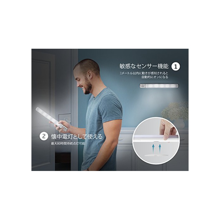 전지식에 간단 설치인감센서 라이트는 3 개3A전지 것만으로 파워풀인 등불을 제공합니다.배선이 불요에 전원이 없는 장소로도 설치 가능.3M테이프와 마그넷식 받침대에,보조 라이트가 필요인 어디에 그렇지만,곧바로 설치됩니다.라이트의 금속 평면을 받침대에 설치하거나,또는「ON」모드에 날렵하게 떼어 내어 수중에 있는 회중전등으로서도 쓸만합니다.또한동봉의 나사가 있고, 토벽등 필요한 장소에서 설치하기 쉽다.스위치의 순번은 OFF-ON-AUTO이므로,조정하는 시 주의하여 주십시오.