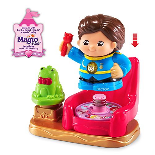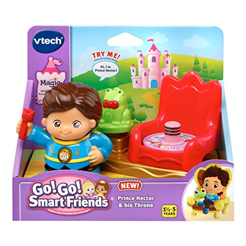 Get ready for adventure with Prince Hector and his Throne from the VTech Go! Go! Smart Friends kingdom. Place Prince Hector on the MagicPoint location on his throne to experience his friendly personality and fun melodies. Explore the realm by placing him on MagicPoint locations on Go! Go! Smart Friends playsets (each sold separately) to trigger different phrases, motion, lights and more. Press his light-up button, and he will come to life by introducing himself, talking about what it’s like to be a prince and singing songs. Each Go! Go! Smart Friends character is unique. Collect them all to create a whole kingdom with princesses, princes, magical creatures and more. Requires 2 AAA batteries (batteries included for demo purposes only; new batteries recommended for regular use). Intended for ages 18 months to 5 years.Feature