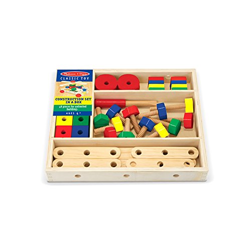 Studio : MELISSA DOUG Publisher : MELISSA DOUG Binding : Kitchen Product Description With 48 wooden pieces (including nuts, bolts, drilled bars to connect, and a child-size screwdriver), this classic building set gives kids all they need to tinker and build! Printed right on the sturdy storage box are building plans for a crane, motorcycle, airplane, and race car to get the fun started. With some imagination and a few creative twists and turns, kids can make hundreds more amazing structures too! Any time kids play with this durable set, they'll be building fine motor skills, problem-solving skills, and hand-eye coordination. Included extension activities guide parents to educational activities that also build early math skills. 0