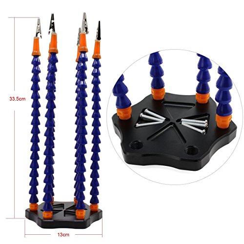 Includes 1 x non-slip aluminum alloy base, 6 x flexible gooseneck helping hands, and wire cutter plier