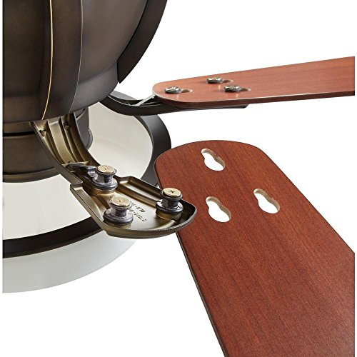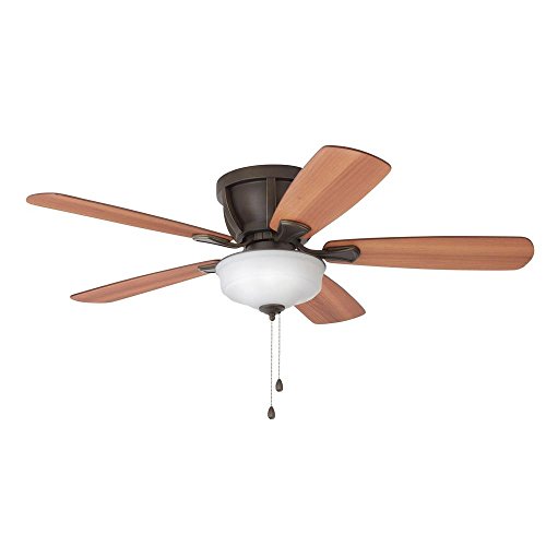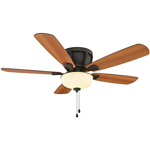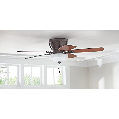 The 52 in. Costner ceiling fan from Home Decorators Collection offers sophisticated elegance in a hugger style to accentuate your decor. The oil-rubbed bronze finish and five reversible blades in medium cherry and maple finish couple with the column inspired housing to create a truly beautiful fan. Function was not forgotten during the design process as this fan includes features like QuickInstall blades for fast and easy installation, a powerful and quiet four-speed reversible motor and a frosted bowl light kit with three14-Watt CFL bulbs included. Five reversible blades in medium cherry/maple finish Oil-rubbed bronze finish Attractive frosted white bowl light fixture 4-Speed motor creates strong air circulation Concealed hardware for added style and beauty Flush mount/hugger styling Indoor use, large rooms Pull chain operation Three 14-watt medium base CFL bulbs included