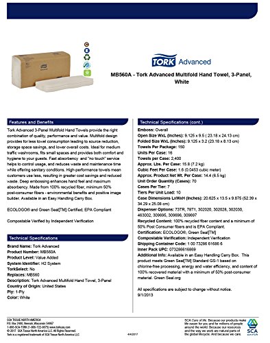 ReleaseDate : 2017-05-10 Studio : SCA Americas LLC Publisher : SCA Americas LLC Binding : Misc. Product Description Tork Advanced 3-Panel Multifold Paper Hand Towels provide the right combination of quality, performance and value. Multifold design provides for less towel consumption leading to source reduction, storage space savings, and lower overall costs. Ideal for medium traffic restrooms, fits small spaces and provides both comfort and hygiene for users. Fast absorbency and "no touch" service helps to control usage, and reduces waste and maintenance time while offering sanitary conditions. High-performance paper towels mean fewer towels are used, resulting in greater cost savings and reduced waste. Deep embossing enhances hand feel and maximum absorbency. Made from 100% recycled fiber, with a minimum of 50% post-consumer fibers - providing environmental benefits and is a positive image builder. Available in an Easy Handling Carry Box. ECOLOGO Certified, Green Seal Certified, EPA Compliant, and Compostable Verified by Independent Verification. Can be used with Tork 73TR, 78T1, 302020, 302028, 302030, and 463002 Multifold Hand Towel Dispensers. 0