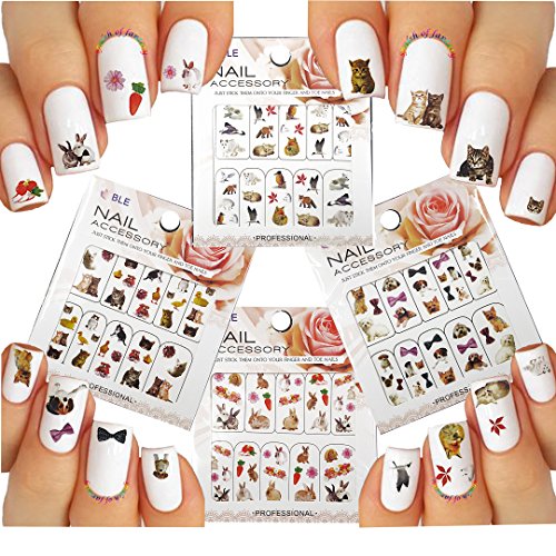 -. Feature : ADORABLE NAIL TATTOOS - 4 sheets with animal and pet designs in variety of colors and sizes: dogs, cats, fox, bunnies, etc / VERY EASY TO USE - Literally takes 20 seconds per nail. No more complex painting! / LONG LASTING - These tattoos will last for weeks or as long as your polish stays on! / INSTRUCTIONS INCLUDED - For application refer to instructions on the back of the package or below / MIX, MATCH AND HARMONIZE - Plenty of designs to choose from. Our Floral tattoos are the wise choice for an elegant manicure