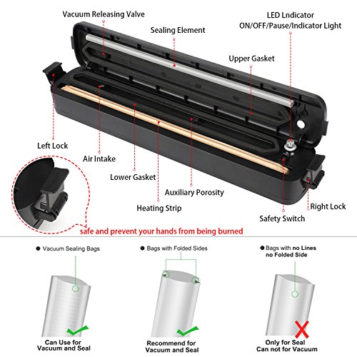 【VERY SAFE】: Safety lock design keeps the food sealing machine tightly closed when being operated, very safe and preventing your hands from being burned. Bag sealing machine comes with 15 vacuum sealer bags. We provide one year returns guarantee. NOTE: Please don't use to seal thing that is too wet as it will suck some liquid out and stay inside the machine which you need to clean up after. And the liquid will damage your machine!