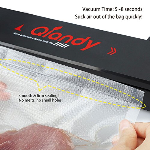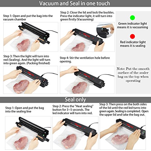 【2 SEALING MODES】: This vacuum sealer machine has 2 modes: Vacuum seal mode and seal the only mode. With strong suction, our vacuum bag sealer can suck the air out of the sealer bags and seal well within seconds. The sealing element can cool fast so that it will not melt the plastic bags or cause small holes. No more worry about the air will seep right back in!