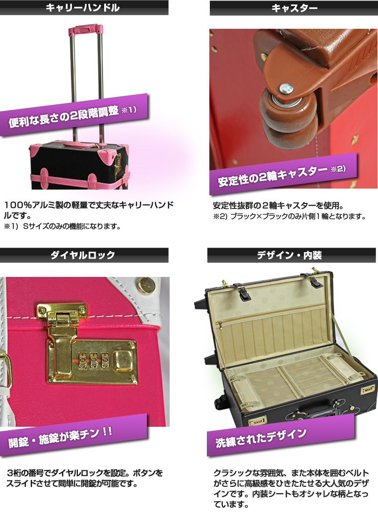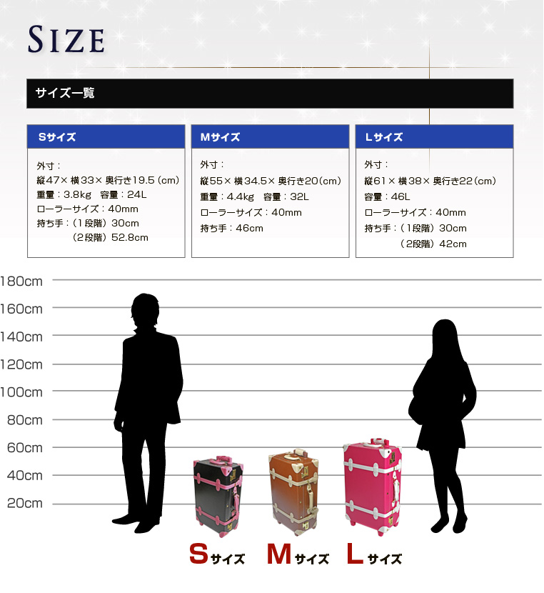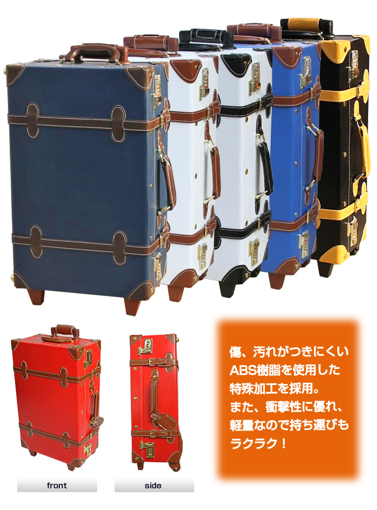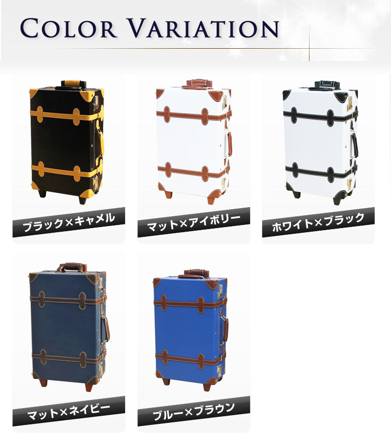 外寸:縦61cm×横38cm×奥行き22cm容量:46リットルローラーサイズ:40mm持ち手:一段目30cm / 二段目42cmカラー:ブルー×ブラウン、ブラック×キャメル、マット×アイボリー、ホワイト×ブラック、マット×ネイビー特徴:クラシック、かわいい、女性に最適材質:表面PVC素材 内装PU素材→ 詳しい保障内容はこちら