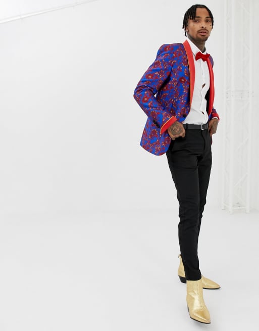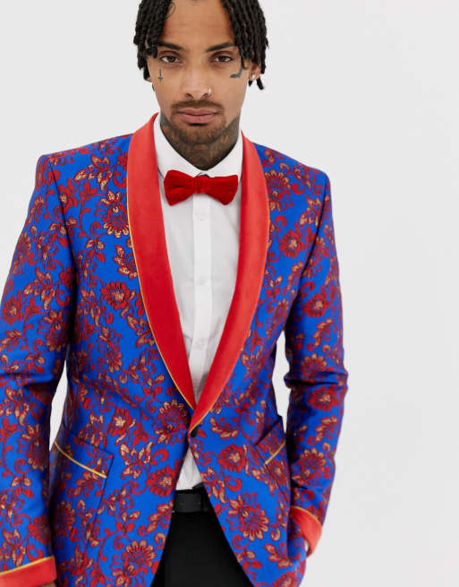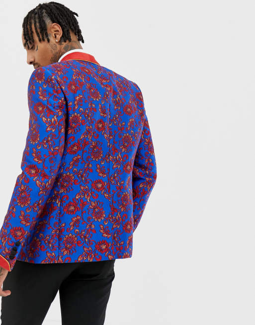 ASOS EDITION skinny blazer in blue and red floral jacquard and shawl lapel