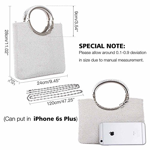 -. Feature : FEATURES: The clutch features one flat pocket and zipper closure to keep your bag closed and items safe. Grade A rhinestone all over the clutch purse, speical bow-shaped clasp, elegant design perfect for all ages in special events, weddings. / CAPACITY: Rhinestone Evening Bag that is large enough to fit your iPhone 7 Plus, Samsung Note 5 or other big size mobile phone along with a few other things you need to carry, such as cards, cash, car keys, small wallet, mirror, lipstick, some makeup etc. / OCCASION: The sparkling bag which is a great accessory for any special occasion.Perfect for wedding parties, formal occasions or a night out. / DIMENSIONS: Clutches: 11.22"(L) * 1.18"(W) * 9.65"(H), Luxury Evening Handbag comes with 47.25" long chain removable. / MATERIAL: Dazzling rhinestone, high quality soft satin lining, light gold / silver plated metal frame with bow-shaped clasp which can be opened and closed smoothly.