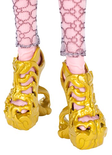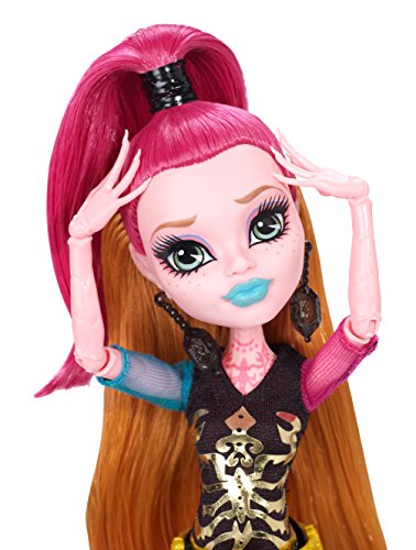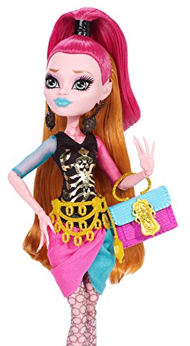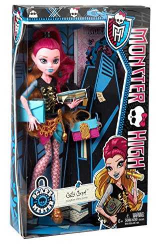 A new Scare Mester is starting at Monster High - and that means new lessons to learn, new looks to die - or undie - for and new beast friends haunting the halls! Gigi Grant, Daughter of the Genie introduced in Monster High 13 Wishes movie, has decided to enroll and is outfitted in her fashionably fierce core school outfit. Mixing blue and pink in graphic blocks, she pairs a black top with golden accents and colored sheer arms with a genie wrap-style skirt. Mesh-type leggings and a golden belt make this fashion one to wish for. Killer accessories include drop earrings, a matching color-block school bag and golden cutout booties. With her hair up in a genie do and bright blue lips, she looks scary cool for the first day of school! Gigi Grant doll also comes with a matching folder, signature-style brush, doll stand and character-specific diary. Collect the rest of the Monster High student body (each sold separately) for a full monster roster! Doll cannot stand alone. Ages 6 and older.Feature
