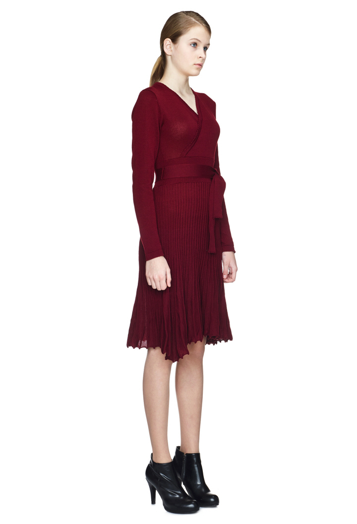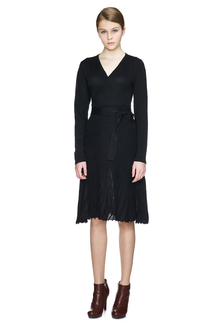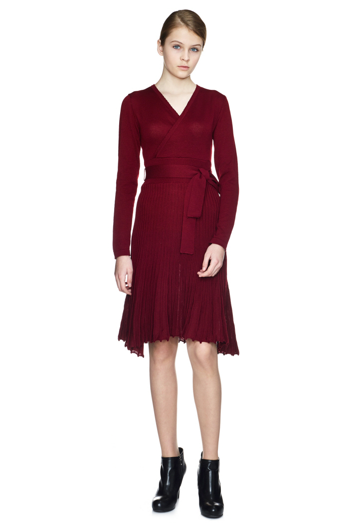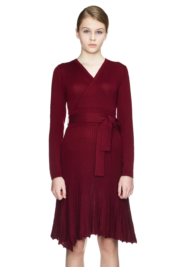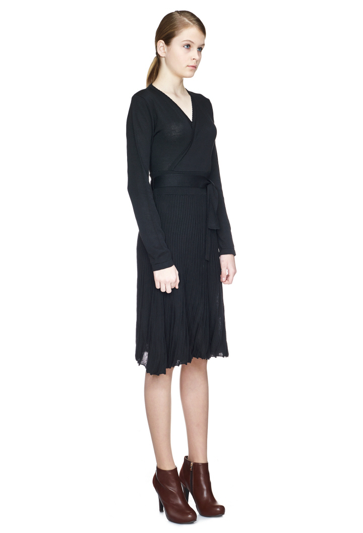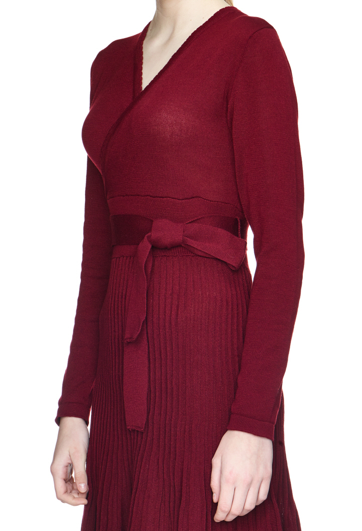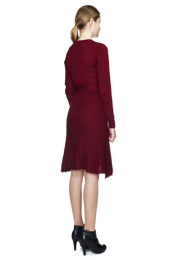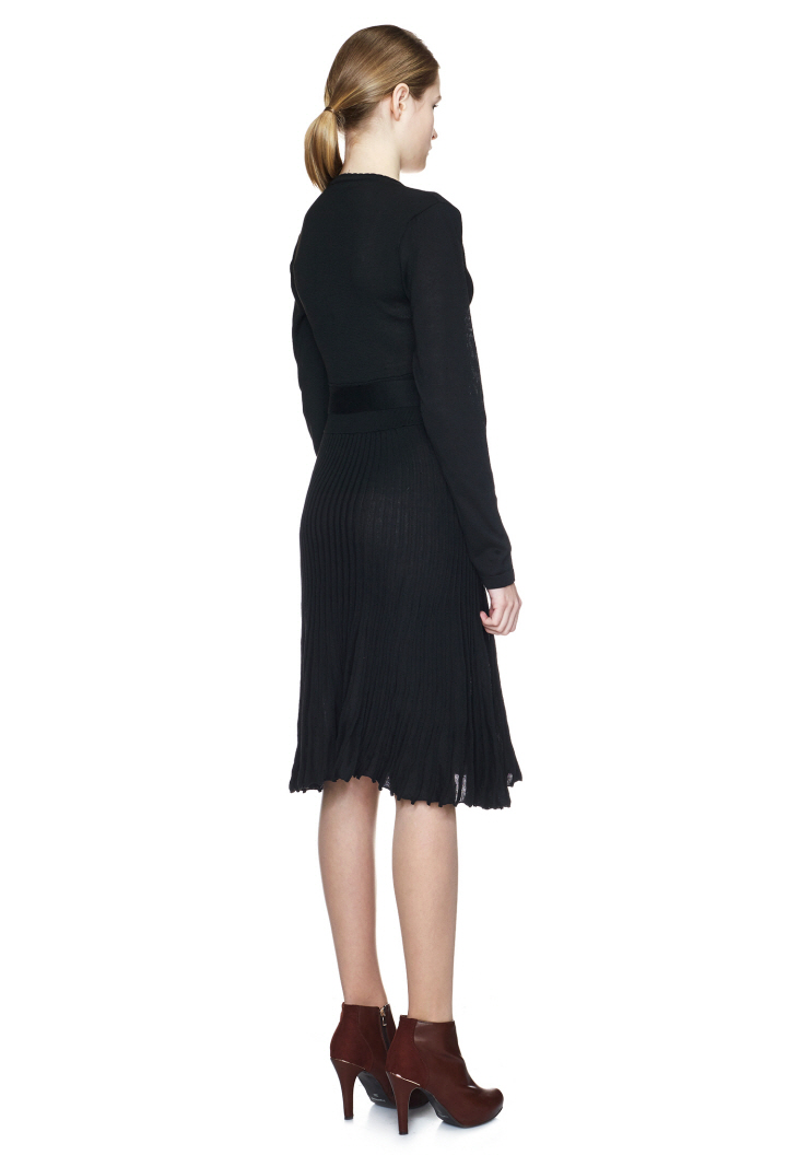 벨트 디테일이 포인트이며, 플리츠 스커트가 여성스러움을 돋보이게 합니다