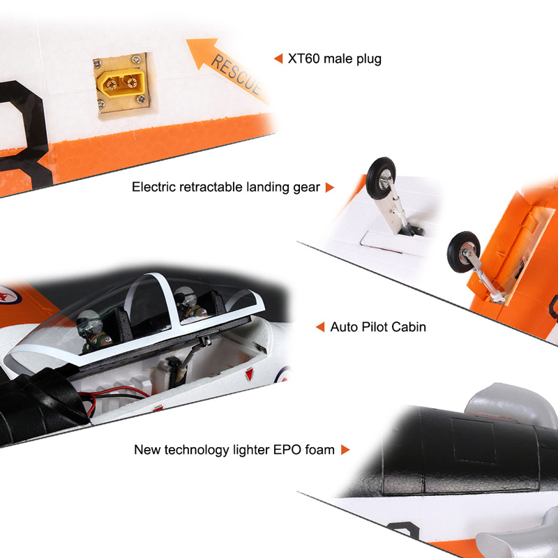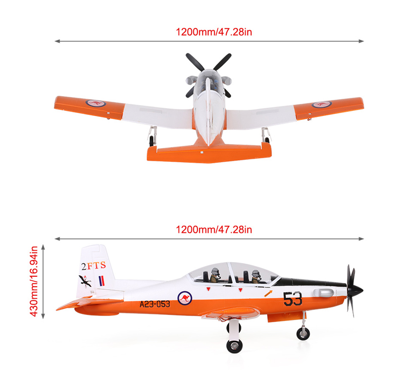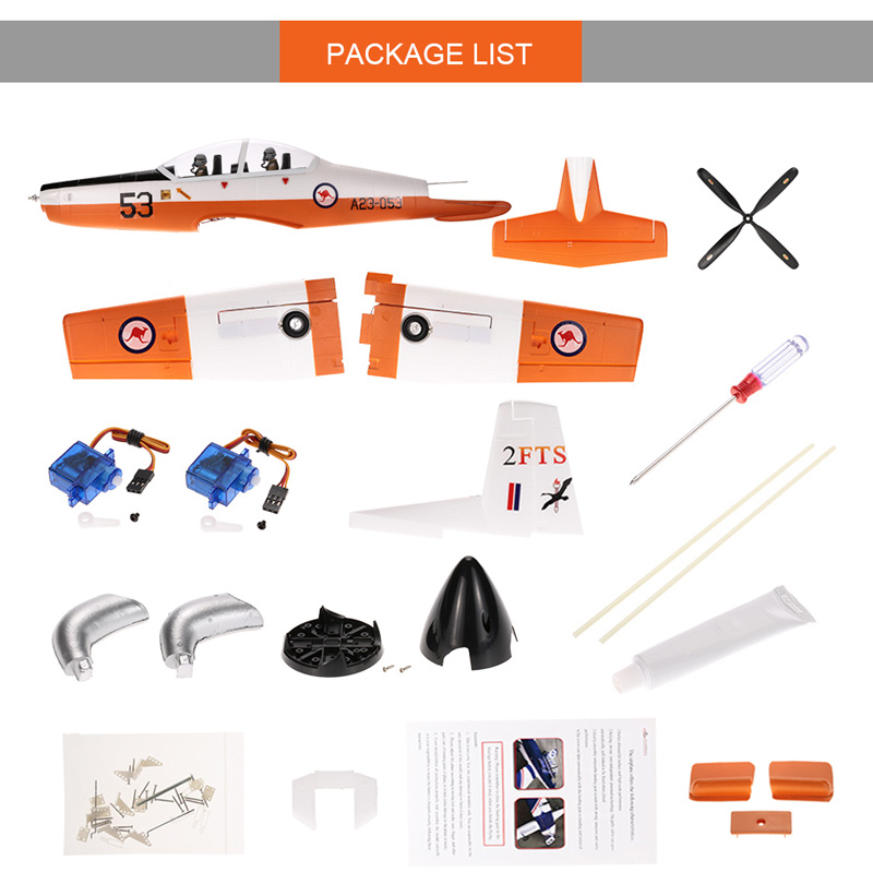 The PC-9 was an improved version of the earlier PC-7 though featured a larger cockpit with ejection seats, more powerful engine, and a host of structural improvements. It has been used by numerous countries as a advanced trainer aircraft. It was even built under license by Beechcraft and used by the United States Air Force as the T-6A Texan II. The fully molded EPO airframe goes together quickly and easily with a minimal of fuss, only a couple of hand tools required. Scale details add tothe realism of this model including antennas, panel lines, and a nice 4 blade propeller. Retractable tricycle landing gear gives excellent ground handling even on rougher terrain. The larger size means it will handle more wind, is quite stable, and willimpress everyone at the field. Access to the inside of the fuselage to install the battery is through a large access hatch that opens and closes right from your transmitter! The ESC is pre-wired with a XT-60 connector ready to accept your 4S 14.8V2200~2600mah lipo. After that, just drop in your choice of 6-channel transmitter and receiver, do final setup, and fly!