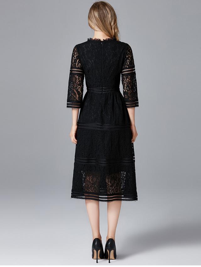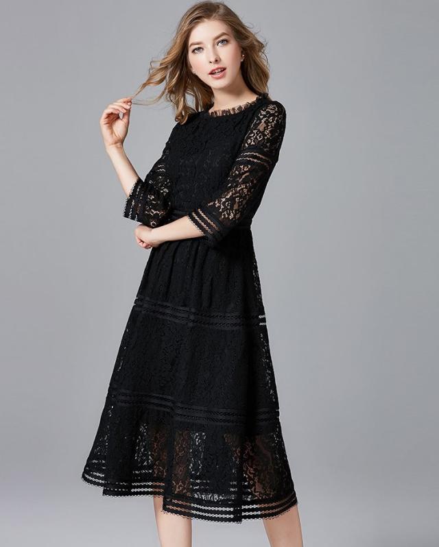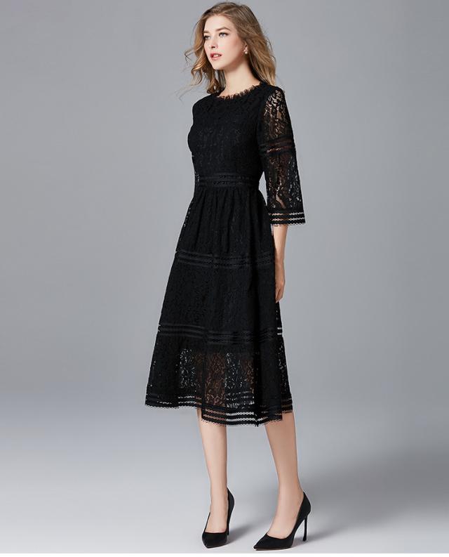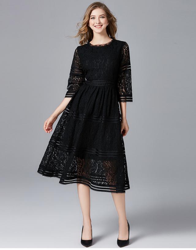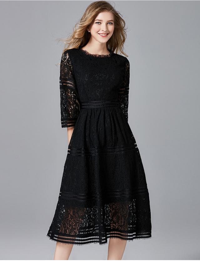 レース 刺繍 暖か素材 アクセサリー付き 七分袖 長袖 ワンピース パーティードレス 結婚式 二次会 披露宴 パーティー デート 女子会 食事会 卒業式 謝恩会 親族 お呼ばれ フォーマル 演奏会 コンサート 発表会 膝下 大きいサイズ L 2L 3L 4L 5L 黒 フレア