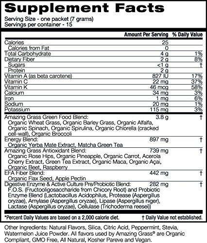 ReleaseDate : 2014-02-18 Studio : Amazing Grass Publisher : Amazing Grass Binding : Grocery Product Description This refreshing blend thoughtfully combines our alkalizing farm fresh greens and wholesome fruits and veggies with Yerba Mate and Match Green tea providing 85mg of natural caffeine for a focused boost to help you feel amazing every day. At Amazing Grass our roots run deep...Back to our family farm in Kansas, where for over 3 generations Amazing Grass has organically grown harvested the most nutrient-dense greens on earth. Today, we thoughtfully craft our greens with the highest quality, plant-based ingredients curated from like-minded farmers from around the world. Amazing Grass products are a delicious way to nourish your body with the whole food nutrition it needs to feel amazing every day. 0