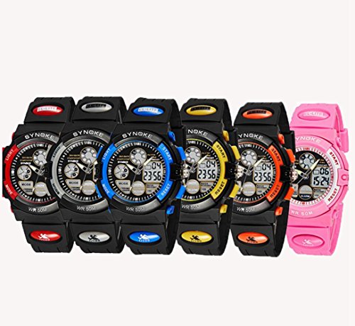-. Feature : Multifunction: Dual time display, digital and analog, backlight,alarm,stopwatch and week display. / High quality elastic PU material band with ABS material case and scratch resistance acrylic mirror surface, sturdy in structure. / With backlight function to show time clearly at night. / Daily water resistance depth to 5ATM, convenient for your daily life(Do not press any button in the water). / Ideal sports watches for kids and friends.