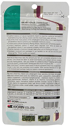 Hikari Cichlid Excel is specially formulated for herbivorous (plant eating) fish. This formula combines wheat-germ, spirulina and vitamins and minerals to provide a diet that is extremely nutritious, easy to digest, provides powerful color enhancement and promotes outstanding growth characteristics. This superior diet can be fed to African Cichlids and many types of plant eating tropical fish with excellent results.Feature