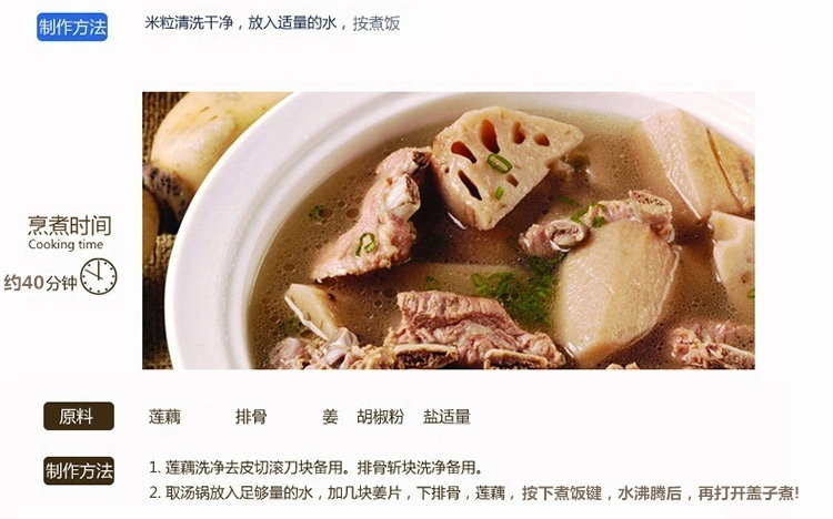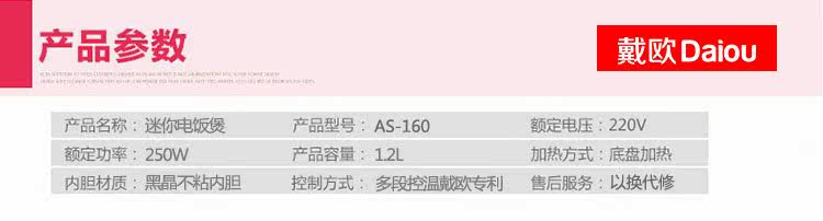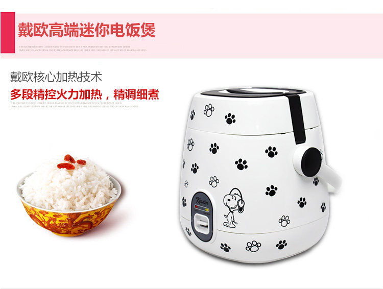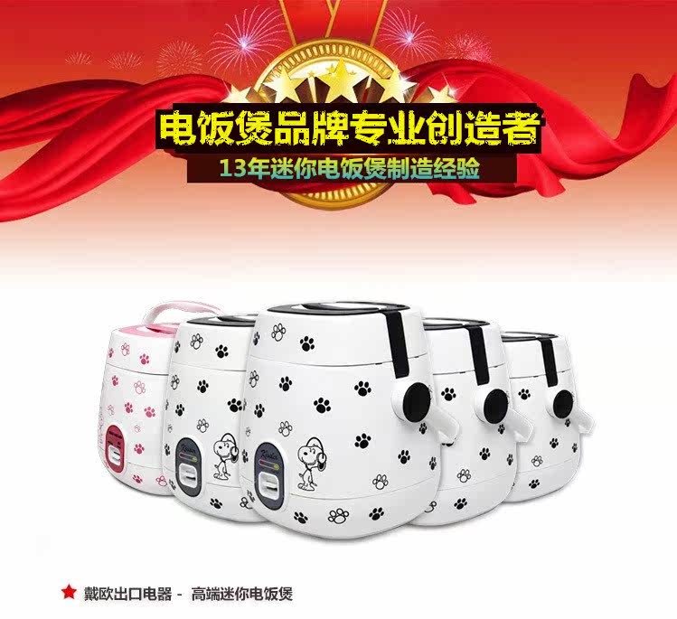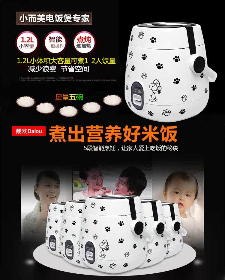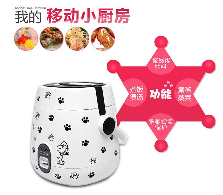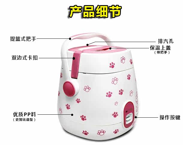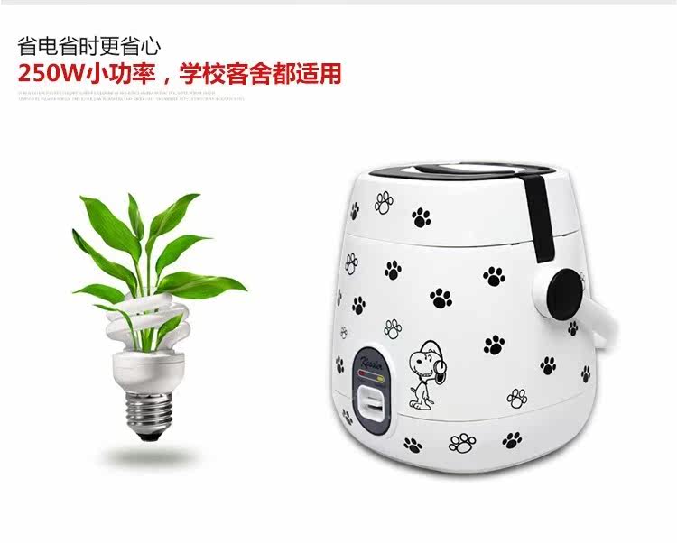 | Rice cooker capacity size problem: the product capacity of 1.2 liters, 250W power, you can cook four small bowl of rice, suitable for 1-2 people use! (Appearance size 17 * 17 * 21cm, liner size 13.8 * 11cm) This paragraph is the mechanical version of the control mode: If you want to porridge soup or cook noodles, it is recommended that people boil water and then open the lid to cook, to prevent overflow! Pro who can be used for the first time to cook a water to eliminate the smell of new products! When cooking, the ratio of 1 cup of rice a cup of water! 1, beautiful mini-rice cooker, do not take up space, easy to place; 2, convenient energy saving, power is only 250W, cook a meal of electricity less than a dime, that is, no energy saving; 3, mini-fluent design, certified food grade box, easy to cook, hot, steamed vegetables, bright, nice; 4, pot body power using separate plug, safe and reliable, removable cover, easy to clean; 5, the inner pot with non-stick coating, non-stick pan, easy to clean; 6, a key switch button, cooking - insulation automatically switch, operation and its simple; 7, double fastened cover, all closed cooking, rice soft, nutrition more delicious; 8, portable mini rice cooker, free to carry convenient; |