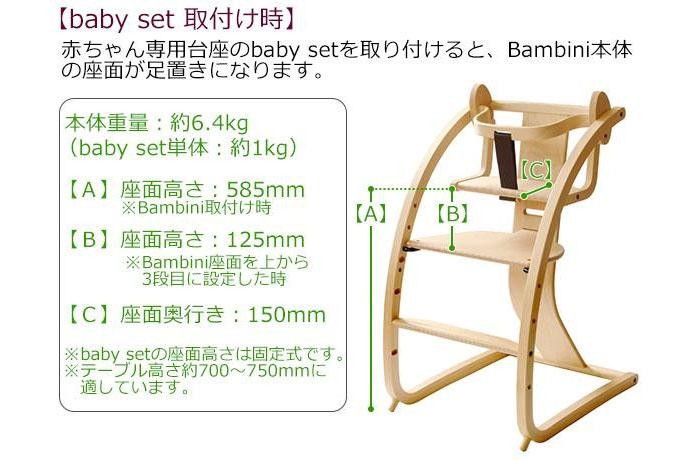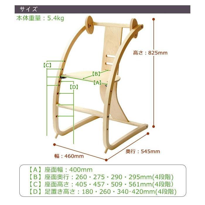 | 座面と足置きの高さを4段階に調整できるので、体の大きさやテーブルの高さに合わせて、子供から大人まで使うことができる椅子です。Bambini本体にbaby setを取り付ければ、赤ちゃんも安定した姿勢で座れる椅子になります。更に、本体を前に倒すと木馬として遊べます。 |