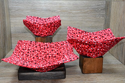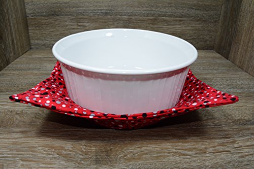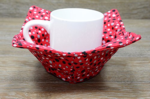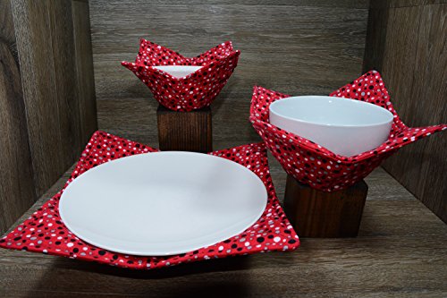 Product Description Microwave cozy set includes 1 small bowl cozy (Approx 6.5" sq), 1 medium bowl cozy (Approx 8" sq), 1 dinner plate cozy (Approx 10" sq.) The dinner plate cozy can also be used for round casserole dishes and the small size is great for coffee mugs! These microwave cozies are the perfect solution to handling super-hot dishes. Cooking and reheating food in a dish cozy makes life so much easier! Place your microwaveable dish inside the bowl cozy and put the whole thing in the microwave to heat. To take the bowl out, you simply grab the corners of the cozy. We found that our kids can now get their dishes out of the microwave safely. Cozies will also protect your fingers from the cold when holding a bowl of ice cream and are great for protecting your table. You can also use a cozy placed on top the dish you are microwaving to help steam food. MATERIALS: * 100% cotton fabric * 2 layers of 100% cotton batting * 100% cotton thread Please be advised: Bowl cozies must only be used in microwaves with a rotating base. To avoid scorching or burning, please make sure cozy freely rotates in your microwave. Never leave microwave unattended. Make sure cozy is clean with no pieces of food attached. Do not microwave cozy for more than three minutes. Cozies can be machine washed on delicate cycle. Reshape and allow to air dry for best results. Please let us know if this is a gift, and we will ship without a packing slip enclosed! #bowlcozy #microwaveable #handmadeatamazon #hot4handmade #buyhandmade 0