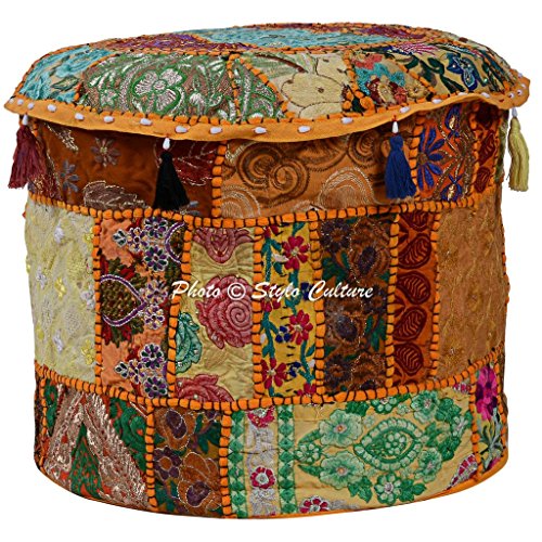 Studio : Stylo Culture Publisher : Stylo Culture Product Description Stylo Culture presents a beautiful ethnic Ottoman Pouf Cover studded with embroidery. In this cover vintage embroidered fabric patches are patched and stitched together at random to create a collage like effect and decorated with all kinds of colored threads, patchwork, raised colored thread work and embroidery in intricate designs with beautiful mirror tassel work. It is a beautiful "Khambadiya" ottoman pouf cover made by artisans in Barmer, India. Witness the exquisite embroidery and thread work on a vibrant cotton backing, creating a stunning collage bursting with gorgeous patterns and colors! PLEASE NOTE THAT IT IS A COVER ONLY AND THE INSERT IS NOT INCLUDED. The pouf cover has a zipped closure at the bottom which can be used to stuff the cover with cotton. The filling can be of cotton, old clothes, beans used in the bean bags or simply you may get it filled from the cotton workers available in your locality. The pouf cover will brighten up the living space in traditional colors. SINCE THE POUF COVER IS MADE FROM VINTAGE FABRIC PATCHES, EACH POUF COVER IS UNIQUE. THERE WILL BE VARIATION IN THE PATCHES HOWEVER THE BASE COLOR OF THE POUF COVER WILL REMAIN SAME. THE UNIQUENESS OF THE PATCHES IS THE SPECIALTY OF THE PRODUCT AS NO TWO POUF COVERS ARE ALIKE. 0