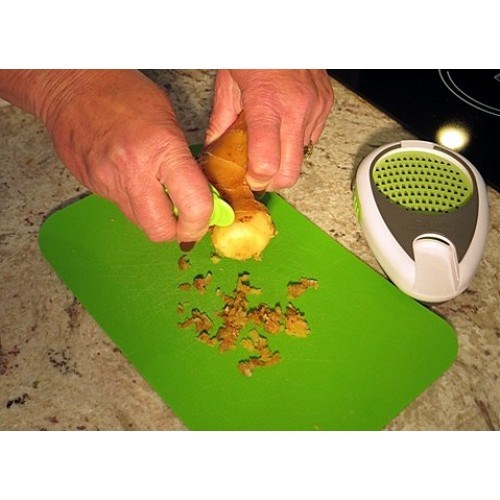 Easily cuts through the root while creating a grated ginger paste or thin slice. Quickly peels the thin skin from the root.