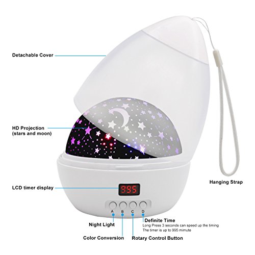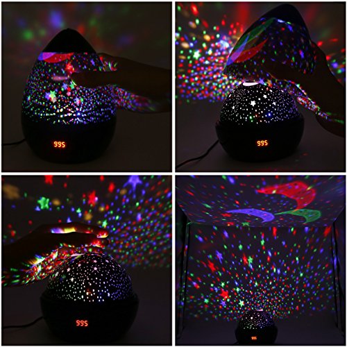 -. Feature : TIMING CONTROL:You can choose 5-995 minutes to set the time control,when the time is end,it will turn off automatically.it would not disturb your sleep anytime.And there are 4pcs LED Beads of warm light, blue light, green light, red light or multi-color combination for Experience a different Starry Night. / CUTE DESIGN AND ATMOSPHERE: Ideal for decorating wedding, birthday, parties. Great for romantic night lamp and decoration light have.You can use it as a camping light with hanging strap, save your space. / BEAUTIFUL:This is a new popular cosmos Star Projector lamp, it can help you put the universe back home, give you a piece of the sky changes color, without need for hard to find the field,rotating its base, there will be different colorful space, find the constellation that you belong to it .It is not only give your child universal Astronomical Science and enhance the capacity of good assistants hands, but also give you the couple to create a romantic surP.R.Ise. / YOUR CHOICE OF POWER:Power pressure of 4 x AAA battery (not included).or 59 Inch USB cable & US Adapter (a $5 value included for FREE) / Quiet & Relaxing:Easy to use. With the new engine, the device makes No noise,so you can enjoy the relaxing starlight in a quiet environment.