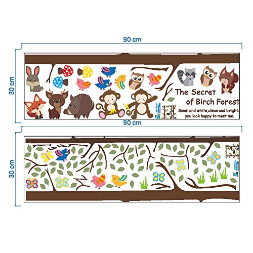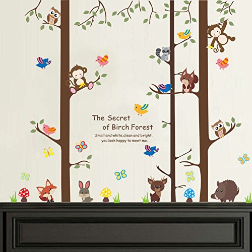 BIBITIME The Secret of Birch Forest Tree Squirrel Owl Monkey Wall Decal Birds Butterfly Mushroom Wild Boar Fox Rabbit Deer Vinyl Sticker for Nursery Bedroom Kids Room Decor