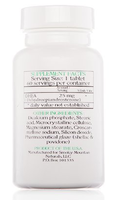 -. Binding : Health and Beauty -. Brand : Smoky Mountain Naturals -. EAN : 0797698464398 -. Feature : LIFE EXTENSION SUPPLEMENT: Helps balance DHEA levels and enhance energy; Works as an anti-aging precursor / FEEL YOUNG AGAIN: Great for bone strength, sexual energy and is anti-aging / QUALITY: Non-GMO, Vegan, Soy-Free, Dairy-Free, Animal Cruelty-Free and Gluten Free. Made in facility that adheres to FDA standards and is GMP certified. / UNMATCHED INGREDIENTS: Our ingredients are sourced from the highest quality available. This is a premium product and unmatched in every way. / EASY TO TAKE: Requires one less pill per serving (though the same Mg. per serving) than competitors! This is a two month supply. -. IsAdultProduct : 0 -. Label : Smoky Mountain Naturals -. LegalDisclaimer : FDA DISCLAIMER: THESE STATEMENTS HAVE NOT BEEN EVALUATED BY THE FOOD AND DRUG ADMINISTRATION. THESE PRODUCTS ARE NOT MEANT TO DIAGNOSE, TREAT OR CURE ANY DISEASE OR MEDICAL CONDITION. PLEASE CONSULT YOUR DOCTOR BEFORE STARTING ANY EXERCISE OR NUTRITIONAL SUPPLEMENT PROGRAM OR BEFORE USING THESE OR ANY PRODUCT DURING PREGNANCY OR IF YOU HAVE A SERIOUS MEDICAL CONDITION. -. Manufacturer : Smoky Mountain Naturals -. PackageQuantity : 1 -. ProductGroup : Health and Beauty -. ProductTypeName : HEALTH_PERSONAL_CARE -. Publisher : Smoky Mountain Naturals -. Studio : Smoky Mountain Naturals -. Title : DHEA 25 mgs (60 Tablets- 2 Month Supply) Boost Hormone Levels, Anti-aging, Improve Bone Strength, and Sexual Functions. Considered the Life Extension Hormone! Soy-Free, Gluten-Free, Dairy-Free, Vegan, Non-GMO, And Animal Cruelty-Free. One Less Tablet Per Serving Than Competitors. 100% Money Back Guarantee! -. UPC : 797698464398