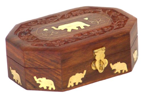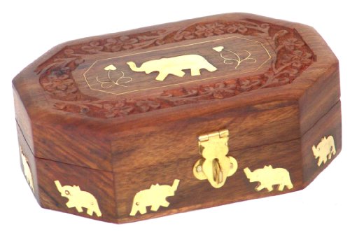 Wooden Jewelry Box Octagonal Handcrafted Elephant Brass Inlay & Wood Carvings