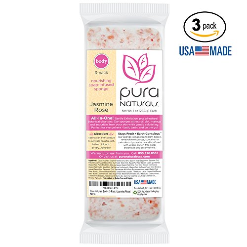 COMPARE SPONGES & INGREDIENTS. PURA GETS RID OF IMPURITIES & DEAD SKIN NATURALLY WITHOUT CHEMICALS OR ABRASIVES. Unlike other body washes & sponges that are synthetic or use harsh toxins & additives, that may cause damaged, dry or itchy skin, Pura's PLANT BASED soft scrubber sponge effectively & gently cleans leaving rejuvenated, smooth skin. Pamper your skin with organic, botanical, all natural interwoven soap chunks & nourishing Shea butter, essential oils, jojoba, cocoa butter & coconut oil.