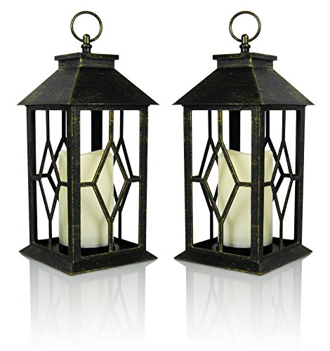 Banberry Designs Decorative Lanterns - Set of 2 Antique Bronze Decorative Lantern with a Flameless LED Pillar Candle and 5 Hour Timer - Outdoor Lighting - 13"H