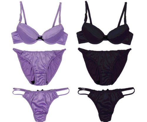 シンプルサテンのブラ+ショーツ+Tバック3点セット ラベンダー ブラック 2色組E75