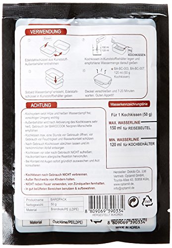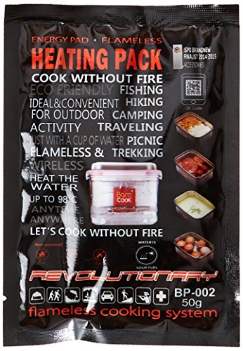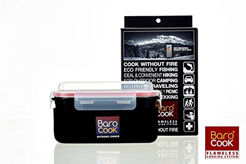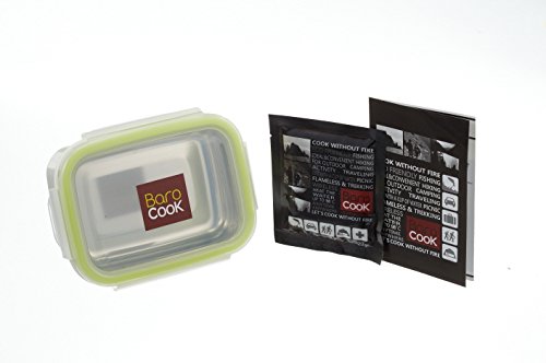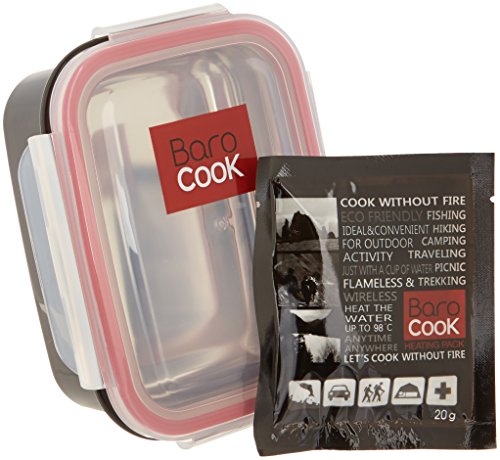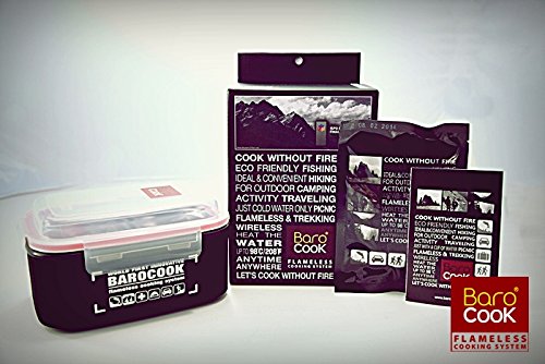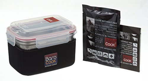 Barocook Flameless Cooking offers a quick, easy and safe way to heat all your foods and drinks without the need of dangerous fuel or a flame. The flameless cooker is a lightweight stainless steel container with a polymer shell, so it's a perfect replacement for bulky stoves. With a little water or even snow, you can activate the heat packs and your meal is hot and ready to eat within minutes; depending on the type of food. Because it is flameless and produces no carbon monoxide, the Barocook stove can safely be used indoors or out.