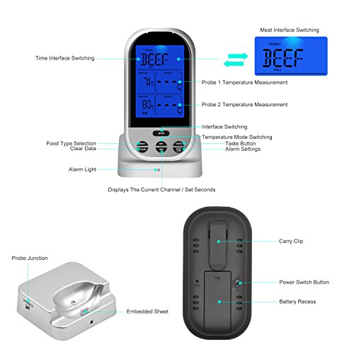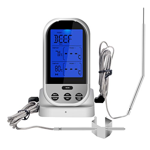 - 【IPX7 Waterproof Dual Probe】The digital wireless thermometer is equipped with dual probes which monitors food temps up to 300ft away and IPX7 water-proof rating that ensures no water damage will befall your kitchen tool,The long one is Probe 1 for FOOD, and the other one with clip is Probe 2 for OVEN.You can effectively monitor two independent heat at the same time.