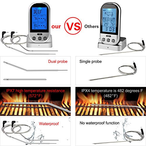 - 【Upgraded Version】 Compare with old style,this meat thermometer feathers waterproof dual probes,230ft Range Remote,Timer alarm,Large LCD Display.What's more,Probe and Wire can withstand up to 716°F (380°C).