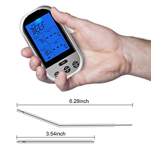 - 【Accurate & Wireless Remote】This wireless remote thermometer with dual probes that allows you to cook by monitoring both your meat and oven temperature from 230 feet away.Both Fahrenheit and Celsius readings,temperature range:-4°F ~ 572°F (-20°C ~ 300° C),Great for Oven, BBQ, Barbecue, Smoker, Grilling.