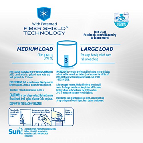 Studio : The Sun Products Corporation Publisher : The Sun Products Corporation Binding : Health and Beauty Product Description Patented Fiber Shield Technology Restores Whites and Protects Colors. he Safe for All Washers. Helps keep your clothes looking their best. Safe on all colors Give us your worst, we'll give it our all. Safe for septic systems. Works effectively, even in cold water. As always , contains no phosphates. 0