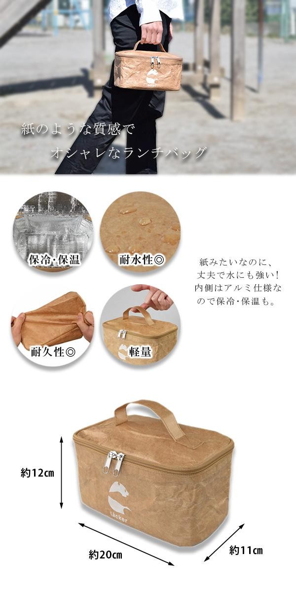 fk094igrjs紙のような質感で軽いランチバッグ紙みたいなのに、とっても丈夫で水にも強い!内側はアルミ仕様になっていますサイズ(約)20×12(持ち手含まず)×11cm個装サイズ:14×3×28cm重量約42g個装重量:52g素材・材質表地:高密度ポリエチレン裏地:アルミ・発泡ポリエチレンファスナー:ナイロン・亜鉛合金製造国中国紙のような質感のおしゃれなランチバッグ紙のような質感で軽いランチバッグ紙みたいなのに、とっても丈夫で水にも強い!内側はアルミ仕様になっています