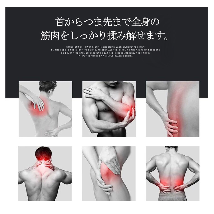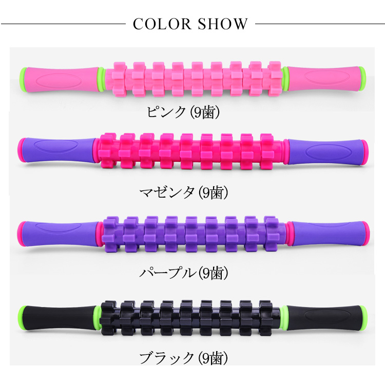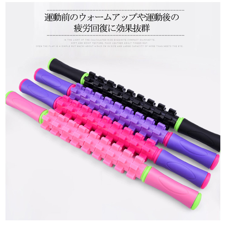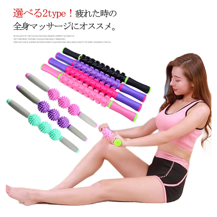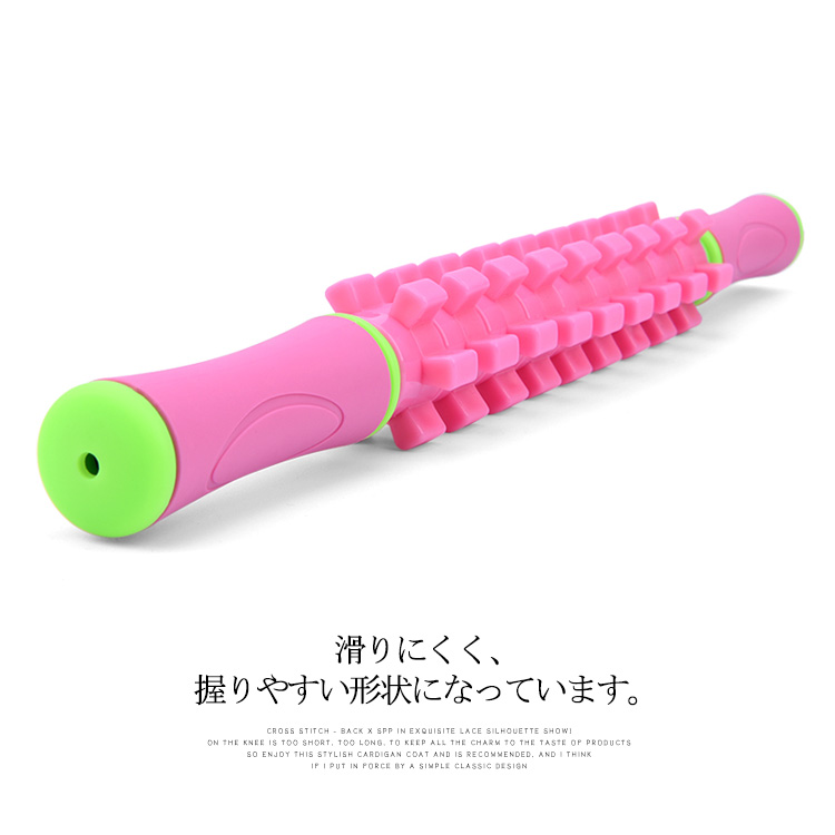 | 選べる2type!疲れた時の全身マッサージにオススメ。運動前のウォームアップや運動後の疲労回復に効果抜群首からつま先まで全身の筋肉をしっかり揉み解せます。血行を良くし、筋肉のコリをほぐします!ほぐしたい部分に押し当てて転がすだけ、少し力を入れて転がすのがポイント滑りにくく、握りやすい形状になっています。 | |
