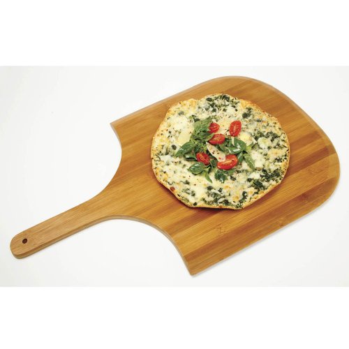 Make those Friday pizza nights even more memorable with this handsome pizza paddle on duty. Uniquely designed with a tapered front edge, the unit slips easily beneath pizza crusts, focaccia bread, or biscuits to remove them intact from an oven rack or baking stone--and since it doubles as a beautiful serving piece, it eliminates the need for transferring the food onto platters or plates on the way to the table. Even better, its long 8-inch handle keeps hands and fingers safely away from the heat source, with a small hanging hole that makes it fast and simple to access when the aroma of freshly baked pizza fills the kitchen. Constructed of high-quality natural bamboo with a lovely wood grain and smoothly rounded edges, the paddle offers a sustainable and an addition to any bakeware collection. Best of all, its generously sized flat surface doubles as an all-purpose serving/cutting board for cheese, hors de oeuvres, and other appetizers and finger foods while entertaining. For best results, hand wash the board with warm soapy water and dry it thoroughly, frequently applying food-grade oil to maintain its luster. The multi-use bamboo pizza paddle measures approximately 14 by 23-1/2 by 1 inches.