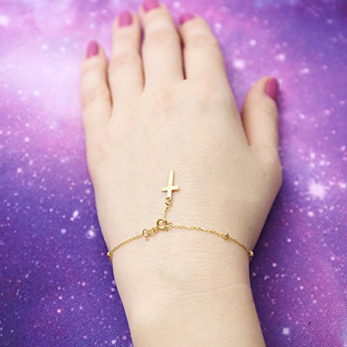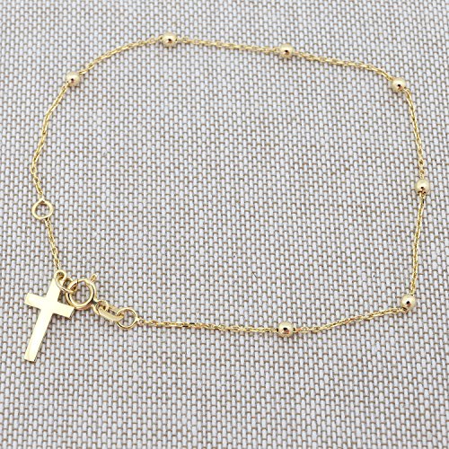 The cross measures 7mm (5/16 in) x 13mm (1/2 in). The bracelet is 0.9mm thick and the beads measure 3mm. The bracelet is 7.25 inches long. The bracelet weighs 1.7g.