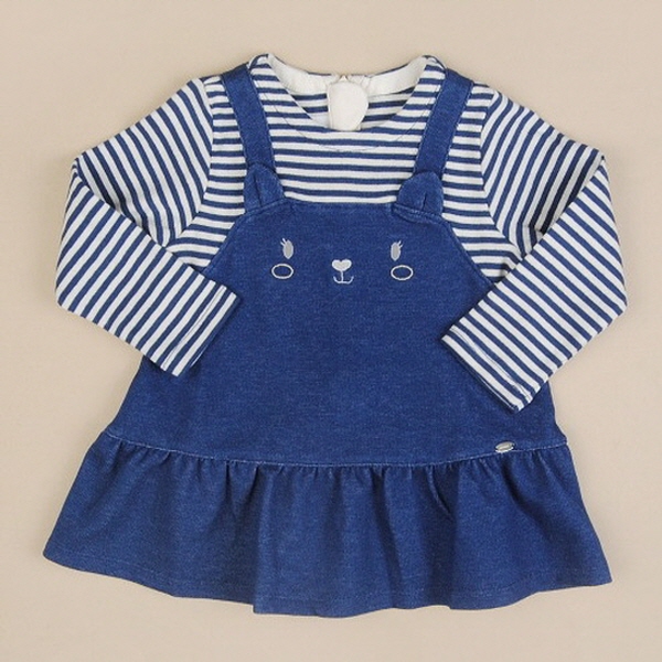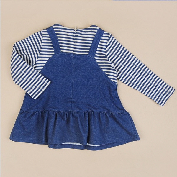데님느낌의 점퍼스커트와 스트라이프티셔츠가 한벌로 부착되어 있는 원피스로