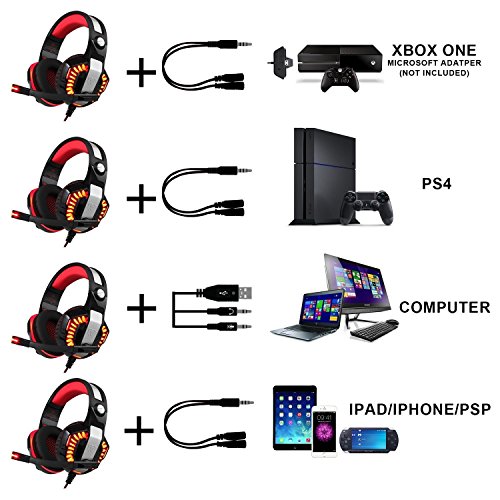 ENJOY GREAT COMPATIBILIT: The headphones has a 3.5mm smart-phone jack but also comes with an extra Splitter for Xbox One, PS4,PC, Computer, Mac,Laptop,Tablet, Mobile Phone like Iphone7/6/63,Samsung Galaxy S7/S6/S5, LG, HTC, HUAWEI etc. With a free Y splitter, the gaming headset fits well for almost any of your devices via its 3.5mm port.