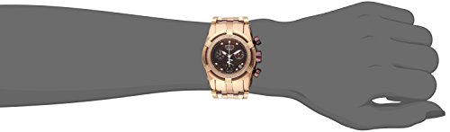 Rose gold-tone stainless steel case and bracelet with a cable wire trim. Fixed rose gold-tone bezel with cable wire trim. Dark rose dial with luminous skeleton hands and dot hour markers. Minute markers around the outer rim. Dial Type: Analog. Luminescent hands and markers. Date display between 4 and 5 o'clock positions. Chronograph - three sub-dials displaying: 60 second, 30 minute and 1/10th of a second. Quartz movement. Scratch resistant flame fusion crystal. Screw down crown. Solid case back. Case diameter: 40 mm. Round case shape. Band width: 27 mm. Band length: 7 inches. Deployment clasp. Water resistant at 200 meters / 660 feet. Functions: chronograph, date, hour, minute, second. Casual watch style. Invicta Bold Chronograph Dark Rose Dial Rose Gold-tone Ladies Watch 15453.Feature