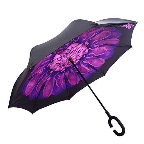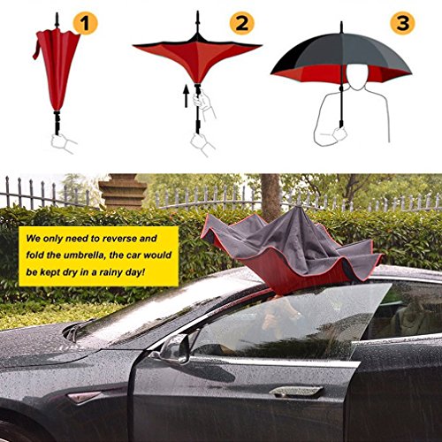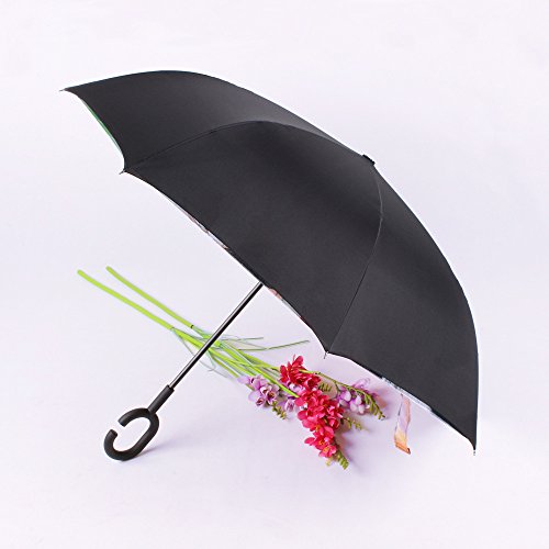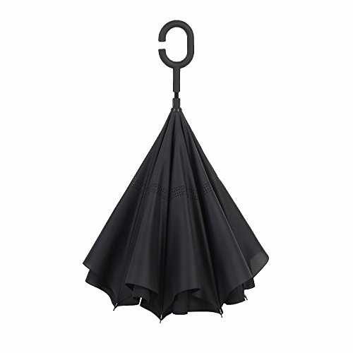 -. Feature : ★.Ideal Gift :Creative Gift for Your Parents,Friends, Colleague,Lovers etc / ★. New Inverted Design:reversing design, solved the trouble exist over 3000 years, inside-out design prevents water from dripping, keeping floors and cars dry / ★. Easy To Storage: It can stand up on its own, ideal for when you have nowhere to prop your umbrella up against. It will also keep the wet part of the umbrella inside once you've closed it, so things don't get dripped on when you put it away after coming indoors / ★. Durable Windproof:The double layer inverted umbrella made of pongee cloth, durable black electric ribs and double layer ribs make the cars umbrella more sturdy, enhance its windproof effect / ★.Hands Free : Good for phone user and mothers, Cross the C-shape handle over your arm, made you hands free for holding a baby, bag or mobile if needed