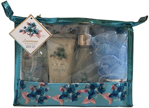 -. Title : Luxurious Aqua Bath Spa Gift Set - Shower Gel, Body Lotion, Bubble Bath, Bath Salt, Puff in a Zippered PVC Bag