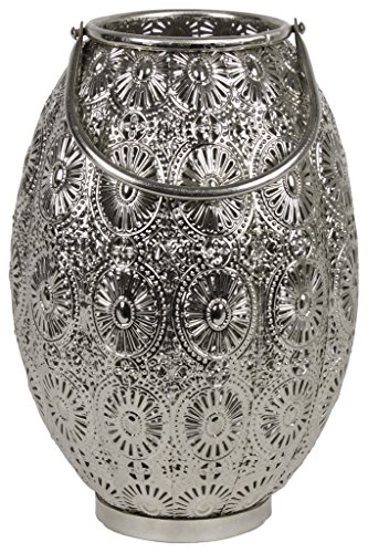 Urban Trends 41058 Tall Round Lantern with Floral Design Pierced Body and Handle/Tapered Bottom Large Metallic Finish, Silver