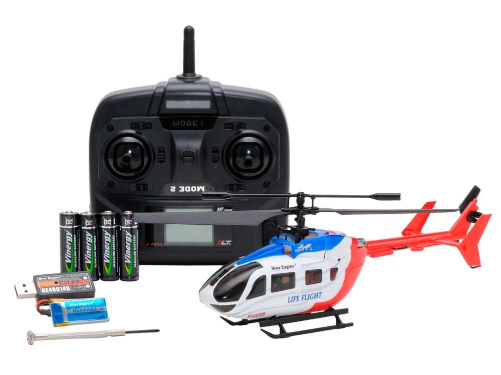 Assembled completed body, 2.4 GHz 4 channel transmitter, USB charger, AA batteries for transmitter, rechargeable lipo battery for flying, tool