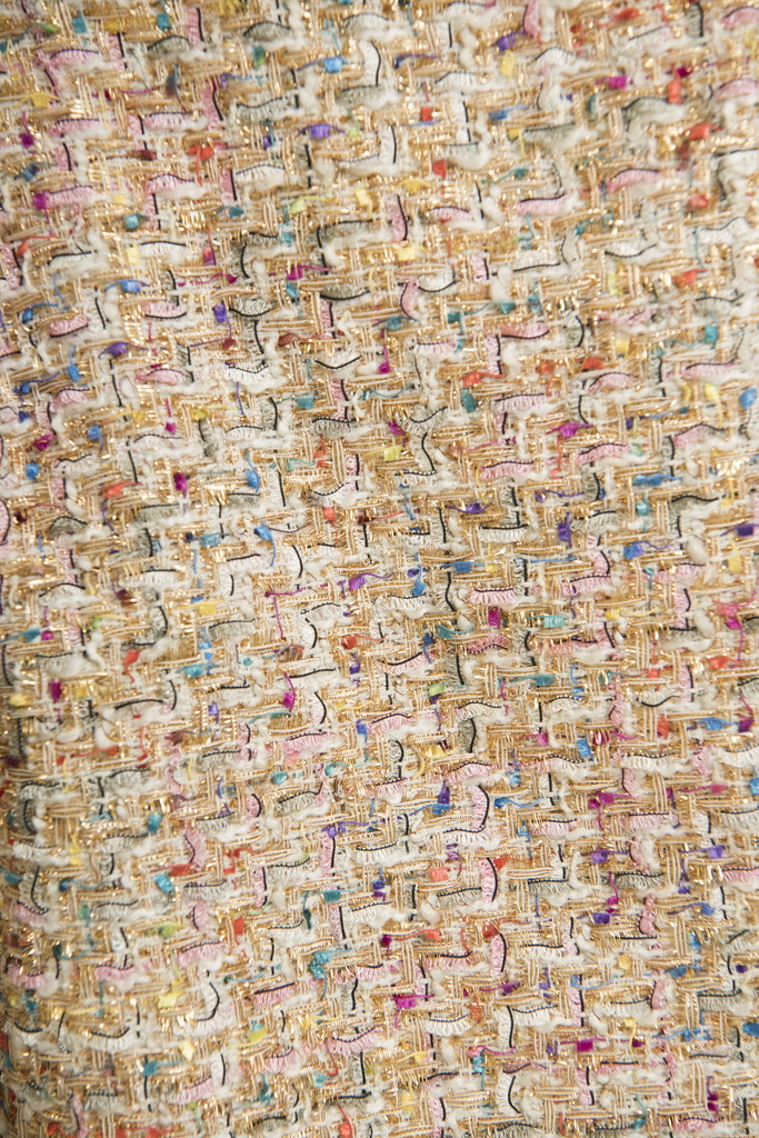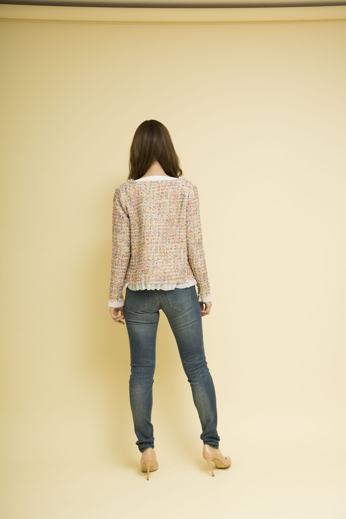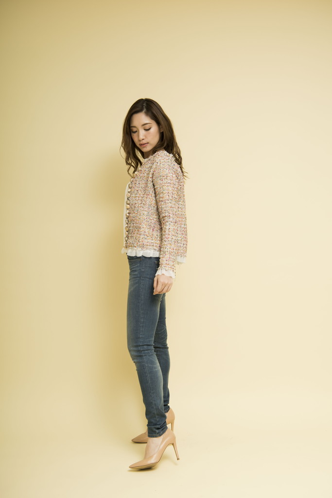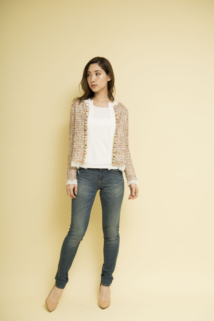 Concept : RADIANT WOMAN品のある女性らしさを大切にしながらも、いつもどこか華やかでありたいトレンドを敏感にキャッチし、 自分らしく新しい着こなしを探している自由な思考をもった華のあるエイジレスな女性そんな女性の日常を輝かせるChicで、Playfulなアイテムを提案春ツィードが可愛いジャケット。裏地の代わりにシフォン生地を使用し少し暖かくなっても長く着て頂けます。前端にはゴールドの色々なボタンを施しビンテージライクに仕上げました。